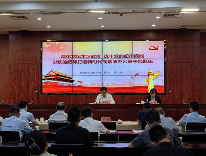 5月13日晚,区政府党组书记、区长马小锋以“深化党纪学习教育筑牢党的纪律底线以铁的纪律打造新时代高素质办公室干部队伍”为题,为区政府办公室全体干部讲授党纪学习教育专题党课。区委常委、区政府党组副书记、常务副区长高婷主持会议。