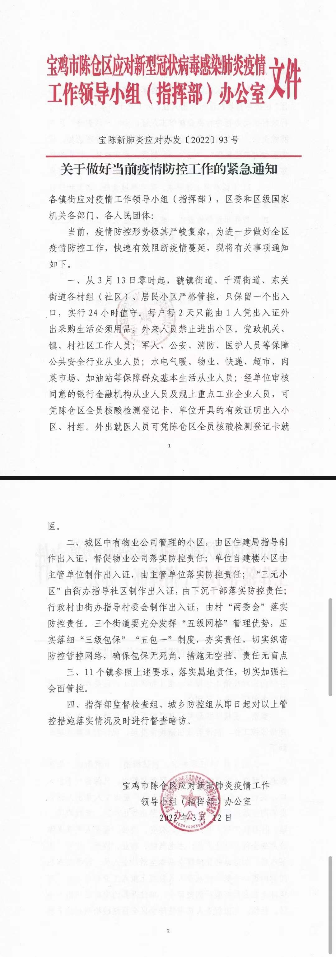 陈仓区关于做好当前疫情防控工作的紧急通知
