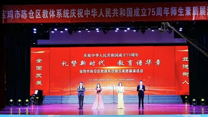 9月29日,由中共宝鸡市陈仓区委教育工作领导小组主办,陈仓区教体局承办的庆祝中华人民共和国成立75周年“礼赞新时代教育谱华章”陈仓区教体系统师生素质展演活动在区政府剧院举行。宝鸡市教育局党组成员李天让,区领导裴振强、苟晓明、柳鹏举、刘博彦、徐宏刚、闫海艳、齐晓辉、王晓妮参加活动。