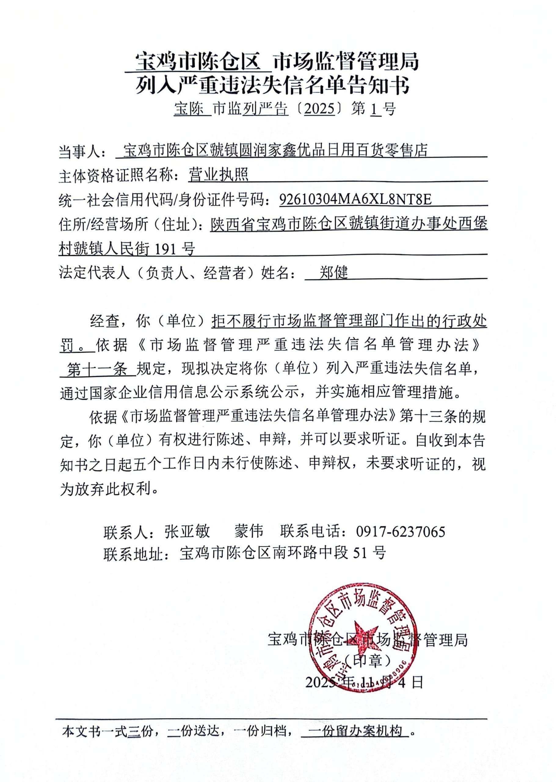 本局于2025年11月4日依法对你(单位)送达《宝鸡市陈仓区市场监督管理局列入严重违法失信名单告知书》(宝陈市监列严告〔2025〕第1号),因你(单位)下落不明/采取其他送达方式无法送达,依据《市场监督管理行政处罚程序规定》第八十二条第一款第五项的规定,本局决定依法向你(单位)公告送达《宝鸡市陈仓区市场监督管理局列入严重违法失信名单告知书》(宝陈市监列严告〔2025〕第1号),内容是:拟决定将你(单位)列入严重违法失信名单,通过国家企业信用信息公示系统公示,并实施相应管理措施。
