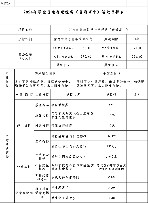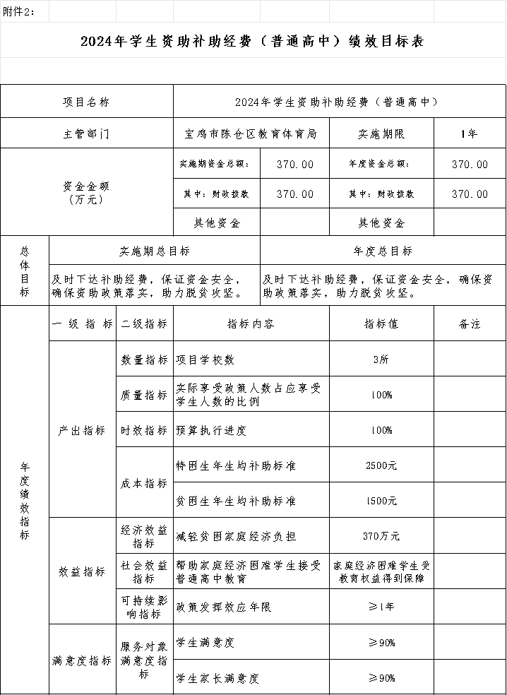 附件2:2024年学生资助补助经费(普通高中)绩效目标表