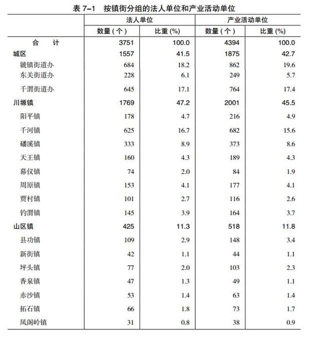 在第二产业和第三产业法人单位中,位居前三位的镇街是:虢镇街道办事处683个,占18.2%;千渭街道办事处641个,占17.1%;千河镇625个,占16.7%。按镇街分组的单位情况详见表7-1。