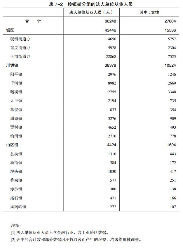 2018年末,城区法人单位从业人员43446人,占50.4%;川塬镇38378人,占44.5%;山区镇4424人,占5.1%。