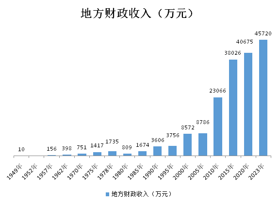财政实力不断增强。财力的增强有力保障了全区各项社会事业的协调健康发展。2023年全区地方财政收入4.57亿元,是1949年的4572倍,年均增长12.1%;财政支出29.62亿元,是1949年的3291.1倍,年均增长11.6%。